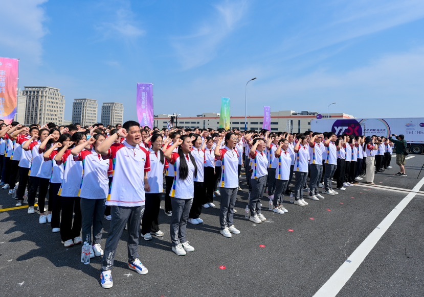 二楼平台上,300余名圆通“快递小哥”举行“杭州亚运会倒计时百天誓师动员大会”,齐整响亮的誓言回荡在物流中心上空,“百日冲刺”的鼓点激荡着每个人的内心。
