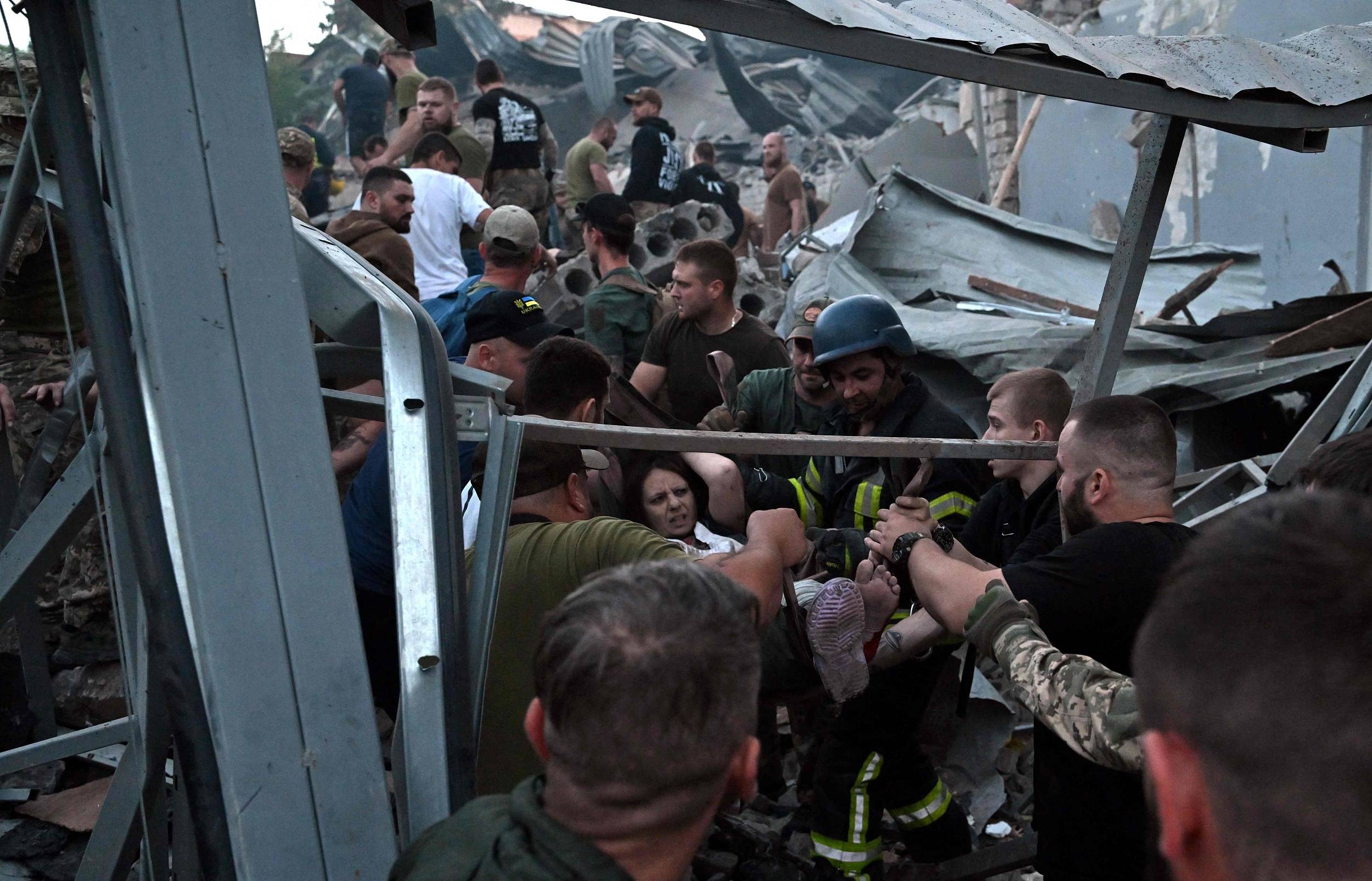当地时间2023年6月27日,顿涅茨克地区,克拉马托尔斯克一家餐馆和几座房屋遭遇导弹袭击,救援人员和志愿者将一名获救的妇女从废墟中抬出来。 视觉中国 图