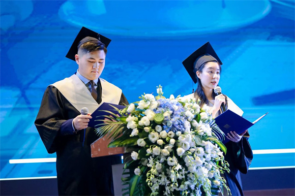 在颁奖仪式和毕业证书授予仪式之后,本次毕业典礼的最后一个演讲来自12年级优秀毕业生代表Edward楼亚和Lucy高田甜。他们精心准备的双语演讲是同学们在各奔前程、追逐梦想之前的最后道别。