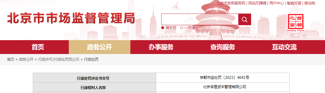 北京市朝阳区市场监管局对北京孚昱资本管理有限公司作出行政处罚