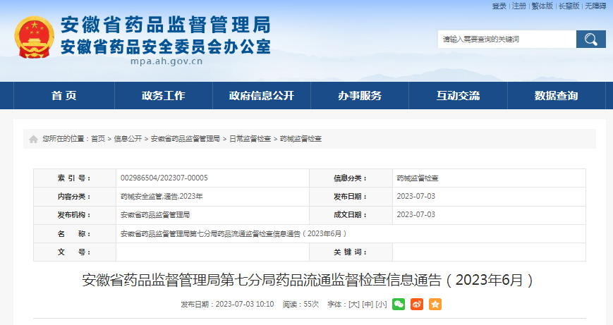 安徽省药品监督管理局第七分局发布药品流通监督检查信息(2023年6月)