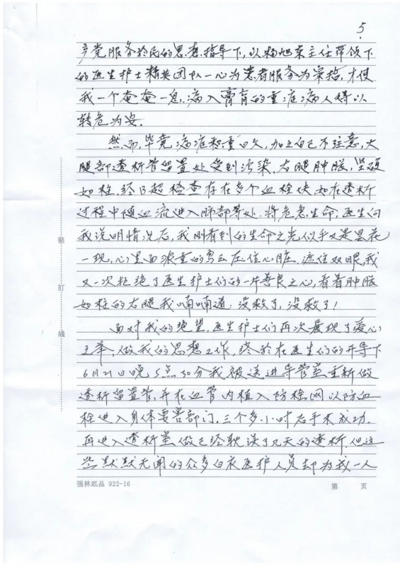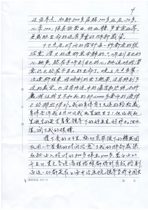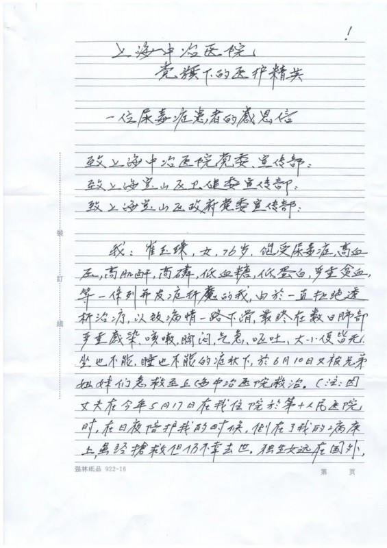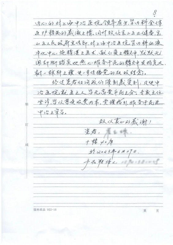 在输血后,我没有了头昏脑涨的感觉,不顾医生护士劝我静养的忠告,我委托弟弟通过我的口述表达发自内心地对上海中冶医院领导有方、对内科全体医护精英守护生命的感激之情。同时致信宝山区卫健委、宝山区人民政府,将上海中冶医院肾内科血液净化中心、胸痛中心施精湛之医术、献仁爱之精神,默默无闻却脚踏实地热心服务于民的精神发扬光大。