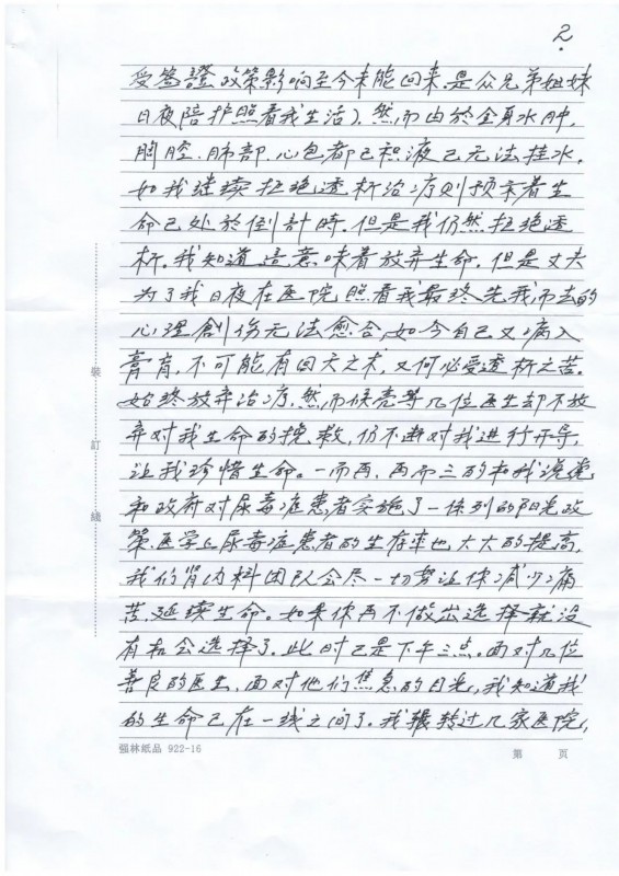 今年5月17日,我在其他医院住院时,日夜陪护的丈夫倒在了我的病床前,抢救无效不幸去世,独生女又远在国外。众兄弟姐妹日夜陪护照看我的生活。然而由于全身水肿,我胸腔、肺部,心包都已积液,但我仍然拒绝透析,我知道,这意味着放弃生命。丈夫为了我日夜在医院照看,最终先我而去的心理创伤无法愈合,如今自己又病入膏肓,不可能有回天之术,我又何必受透析之苦呢?