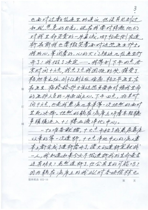 此前,我辗转过几家医院,也面对过数位医生的建议,但我从来没有见到过如此急切、真诚的目光。他们真心实意地为我着想,竭尽全力想挽救我的生命。我要对得起他们对我生命负责的一片真诚,哪怕是倒在透析机前,我也要微笑着面对这些医生护士!我紧闭着的心门被这几位医生打开!我接受了杨旭东主任、刘千红主任、侯亮医生、杨卫平医生、左权医生、梅璐璐护士长这些关爱和珍惜我生命的医护人员的一片赤诚之心。16:00,是我患病几年来第一次坦然面对生死抉择,坦然地躺在病床上,听着车轱辘声,缓缓进入医院13楼血液净化中心。