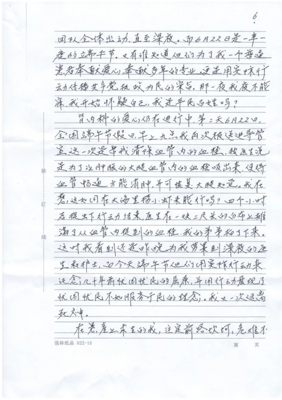 3个多小时后,手术成功,然后再进入透析室做已经耽误了几天的透析。这些医护人员,为我一人全体出动,工作至深夜。6月22日就是一年一度的端午节了,又有谁知道他们为了我一个普通患者无私奉献,那一夜,我夜不能寐。