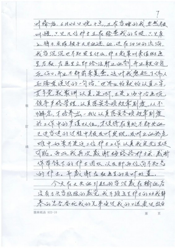 “两位护士的认真负责,使得我在不断失血已近昏迷中被及时发现。”