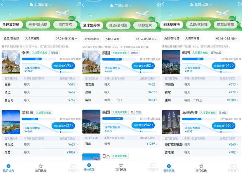 以热门客源地机场数据来看,截至7月5日,暑期上海虹桥机场出发国内机票均价为1306元、出境机票均价为1563元。而对于热门长线目的地,根据携程数据,截至7月5日,暑期乌鲁木齐国内到达机票均价为1877元、喀什国内到达机票均价为1406元。而查看携程APP可以发现,暑期前往东南亚百元机票仍十分充足。