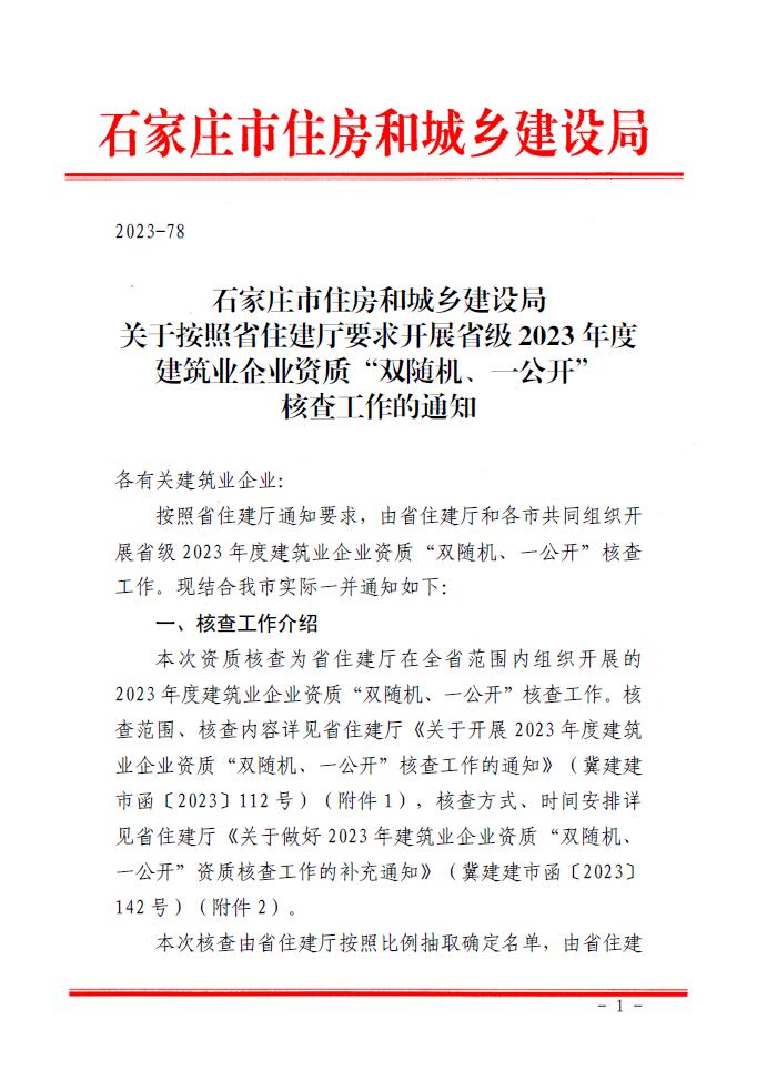 附件1:河北省住房和城乡建设厅关于开展2023年度建筑业企业资质“双随机、一公开”核查工作的通知.pdf