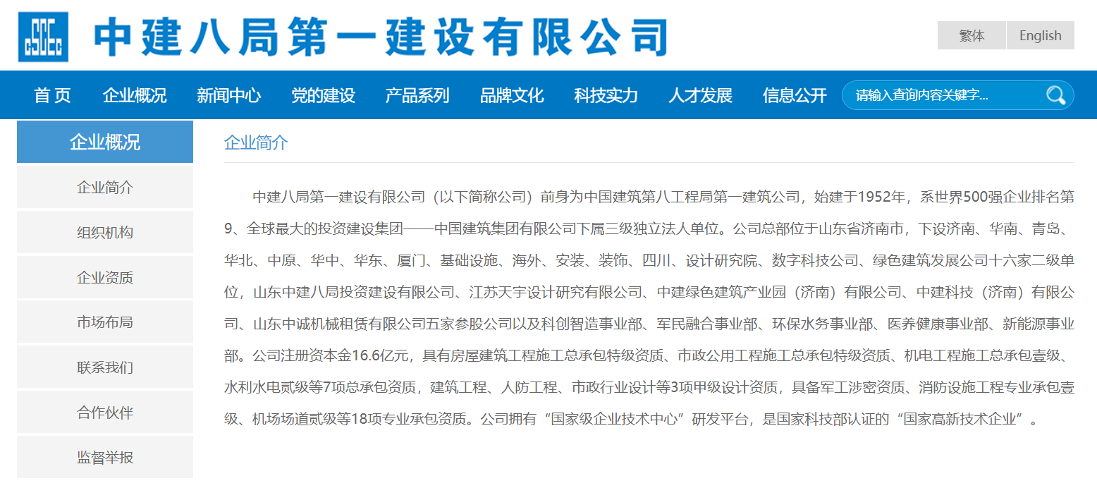 中建八局第一建设有限公司网站显示,中建八局第一建设有限公司前身为中国建筑第八工程局第一建筑公司,始建于1952年,中国建筑集团有限公司下属三级独立法人单位,公司总部位于山东省济南市,注册资本金16.6亿元,具有房屋建筑工程施工总承包特级资质、市政公用工程施工总承包特级资质等18项专业承包资质。