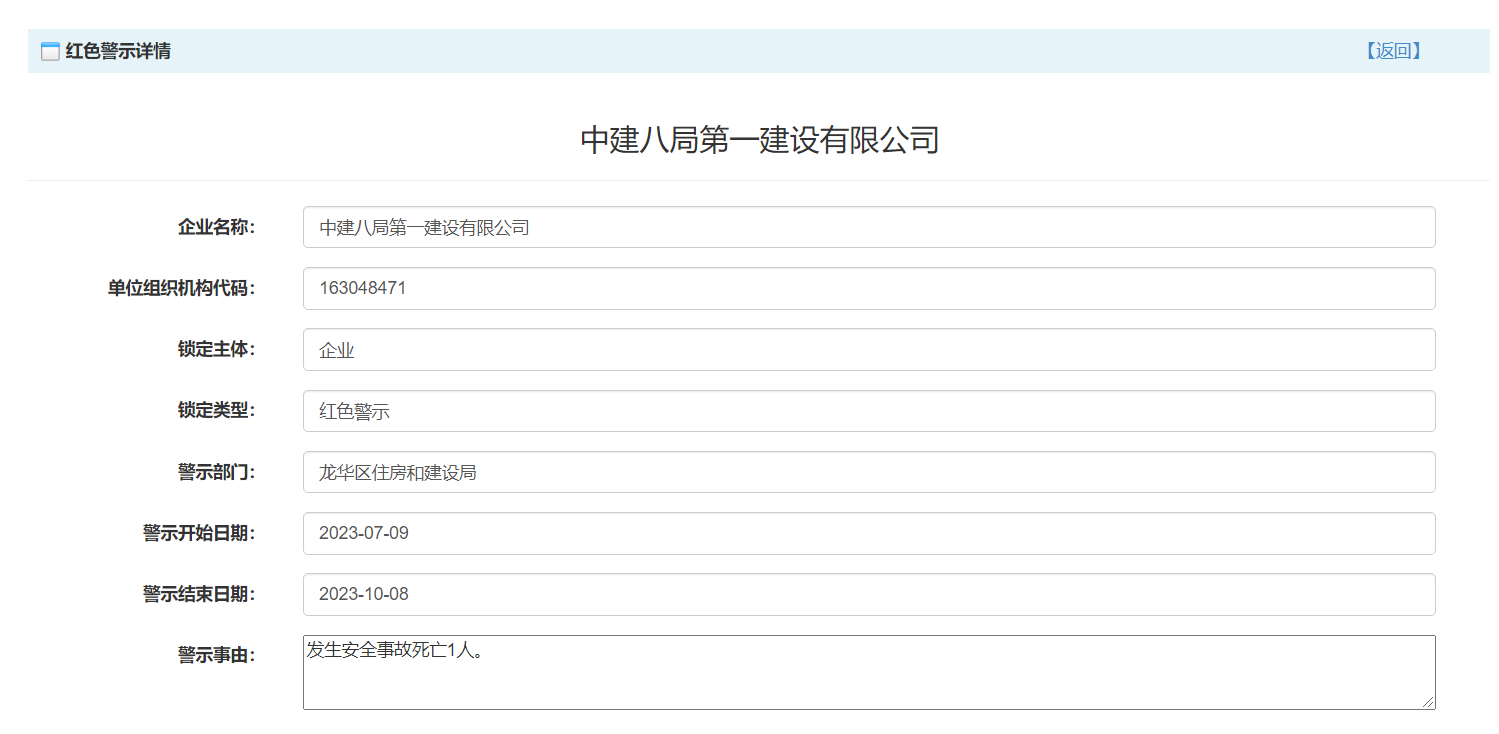 发生安全事故 中建八局第一建设有限公司被红色警示