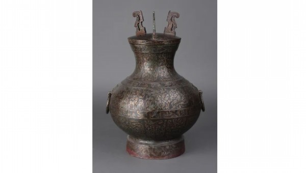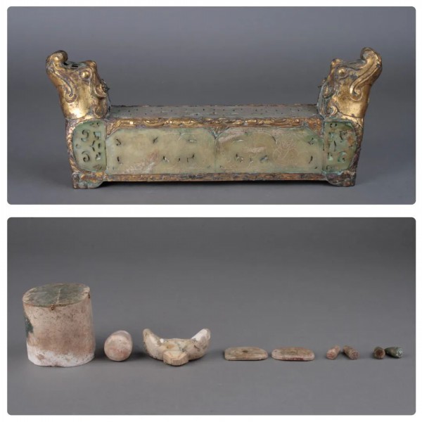 △西汉鎏金镶玉铜枕(上)和西汉玉九窍塞(下)
