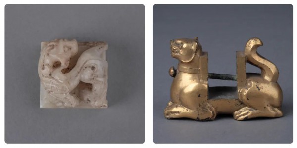 △西汉螭虎钮方玉印(左)和西汉鎏金虎形铜器座(右)