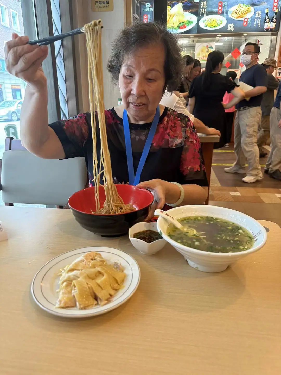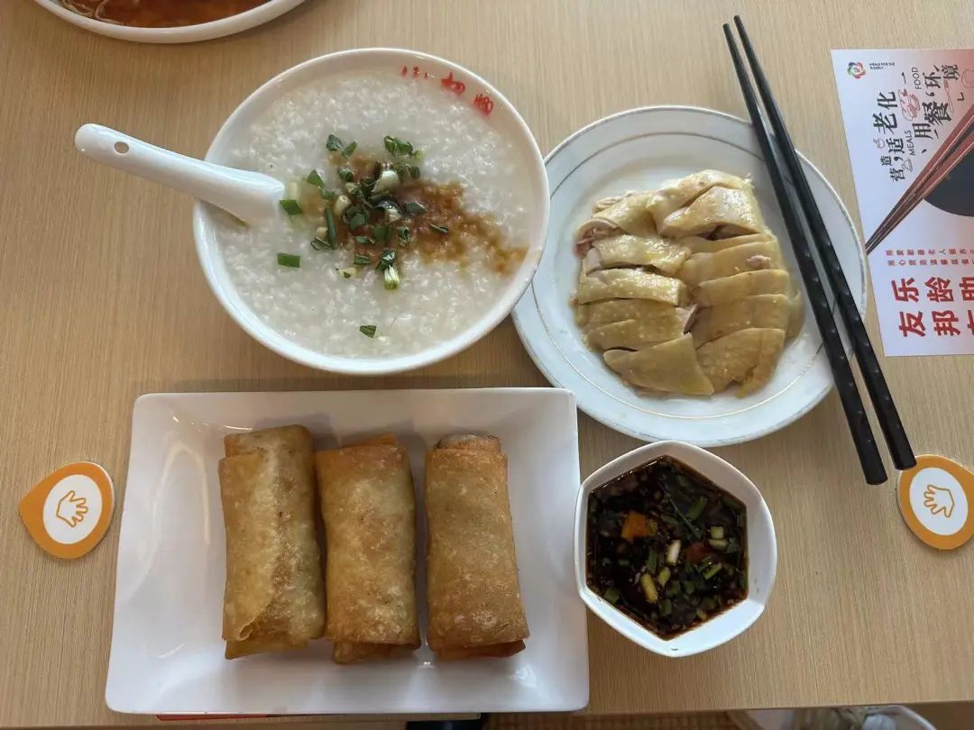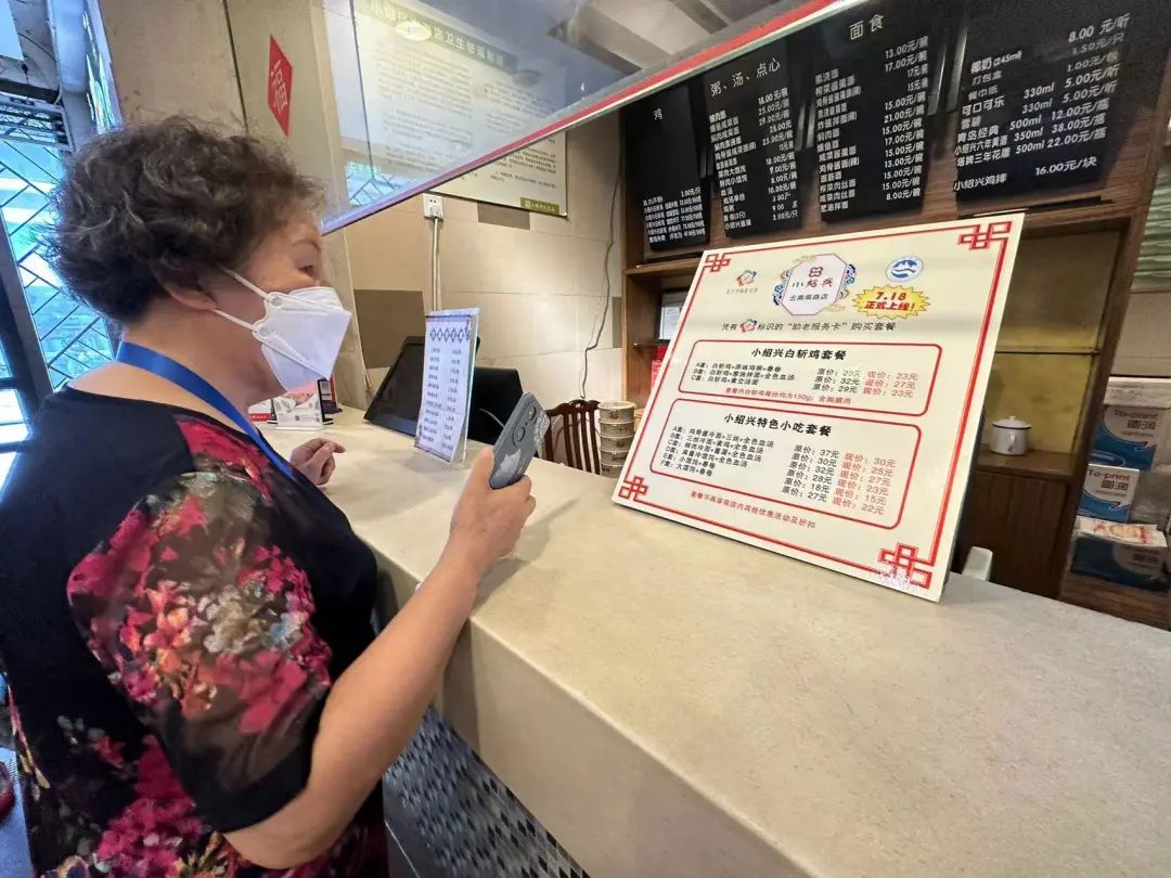 “真是太实惠了!今天第一天,我特地赶过来吃吃看。”当天上午10点半,家住瑞福大楼的顾阿婆就和邻居一起相约,来到了云南路上的小绍兴门店,因为是第一次到老字号门店享受老年专属就餐“福利”,他们也是抱着试试看的心态询问了工作人员,得知已经开放了老年套餐,顾阿婆很开心,凭着街道发放的“五边十色养老服务卡”,她享受到了老年套餐,葱油拌面、三黄鸡、鸡鸭血汤,原价32元,现在只需27元,吃饱吃好。