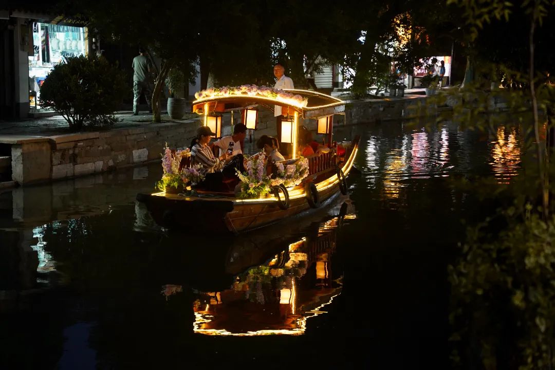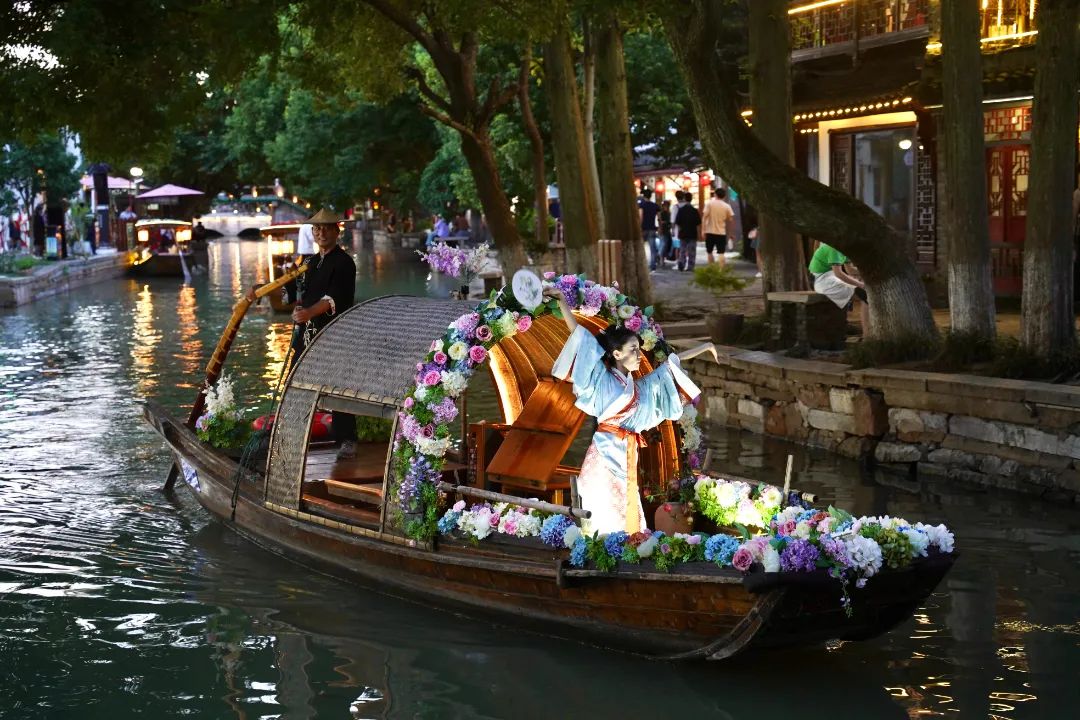 当然,你也可以亲自坐上花舟,看船桨拨开碧水金光,穿过千年历史的桥洞。在岸上人看来,你也是江南画中景。