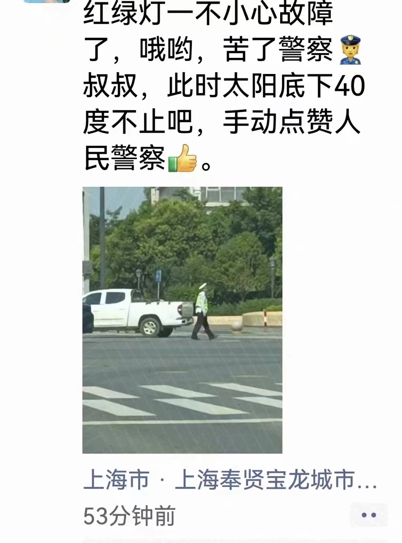“红绿灯一不小心故障了,哦喲,苦了警察叔叔,此时太阳底下40度不止吧,手动点赞人民警察!”日前,公安奉贤分局交警支队民、辅警在烈日曝晒下及时补位“故障信号灯”的感人一幕被过路群众记录下来,转发至微信朋友圈,赢得市民群众一致点赞。