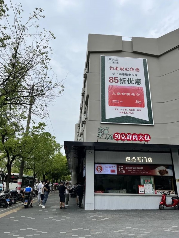 此外,灯箱广告上还有一排红字:凭上海市敬老卡,一大荤、一小荤、两素菜、一例汤仅需12.75元。餐厅相关负责人表示,这是专为老年人提供的优惠套餐,公司每周会出一份菜单,确保一周七天菜品不重样。