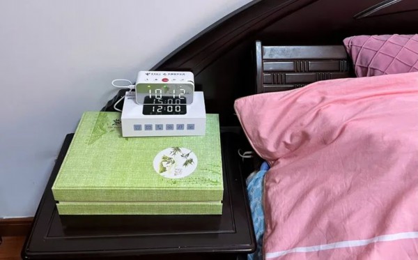 在楼阿姨床边,可以看到已经安装完毕的“助老一键通”设备。从外形上看,设备像电子闹钟,其核心功能在于一旦发生紧急状况,老人可以立即按下设备上方红色的“一键通”按键,为老服务中心、城运中心、社区会立即收到信息,派出专业救援人员第一时间介入处置。点击“电话”按钮,老人则可以与114服务平台取得联系,预约各项为老服务内容。