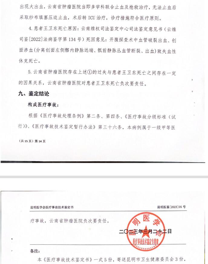 2023年3月22日,经昆明市卫健委委托,昆明医学会出具了一份《医疗事故技术鉴定书》,鉴定结论:该病例属于一级甲等医疗事故,云南省肿瘤医院负次要责任。