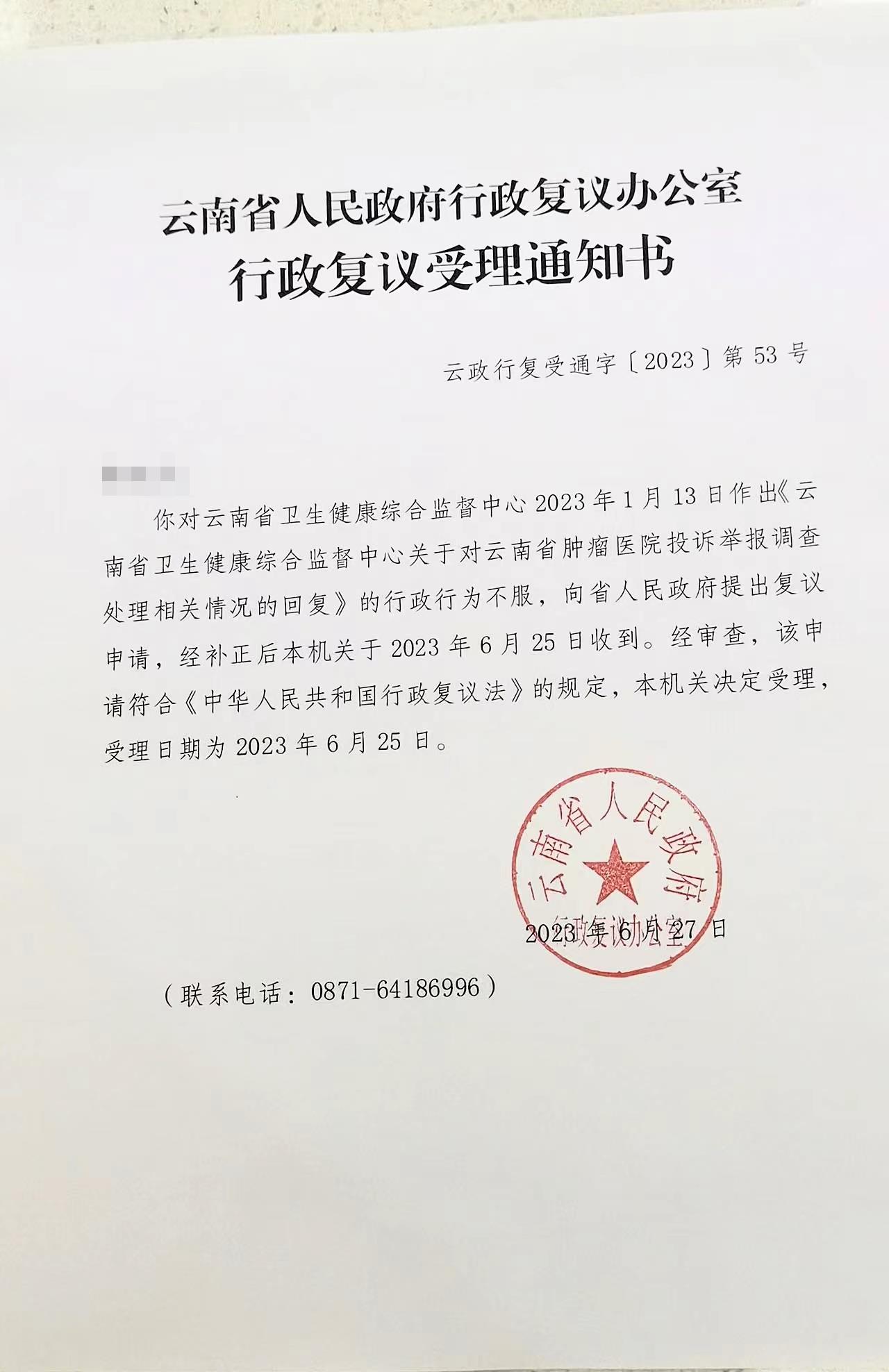 因对云南省卫生健康综合监督中心2023年1月13日作出的行政行为不服,王卫东的家属向云南省人民政府行政复议办公室提起了行政复议。6月27日,该机关出具的通知书显示,该机关已决定受理。