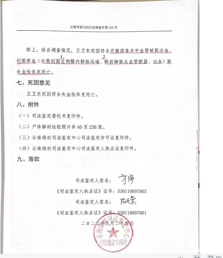 2022年9月24日,云南维权司法鉴定中心出具《司法鉴定意见书》,王卫东死因符合开腹探查术中血管破裂出血、创面渗血致失血性休克死亡。