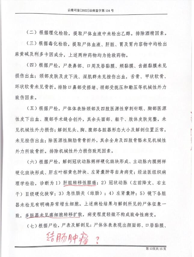 云南维权司法鉴定中心进行了尸检,诊断为肝脏转移性腺癌,急性肠炎(结肠)等,并未见直肠癌。尸检注明,病检结果与解剖所见的尸体征象一致、相互印证,多脏器未见癌细胞转移扩散,病变程度轻微不构成致命性病变,符合失血性休克死亡的法医病理学特征。