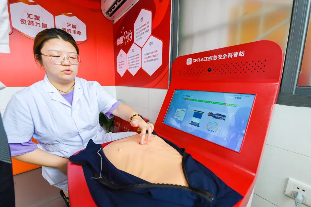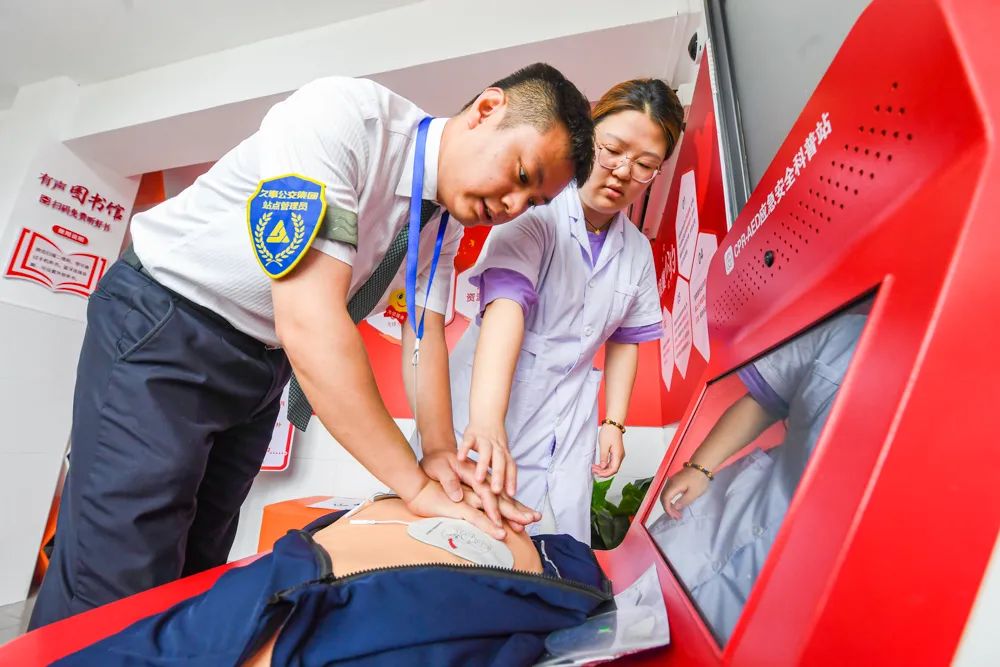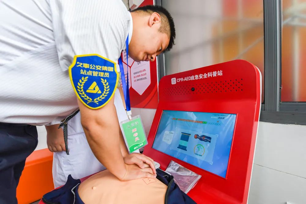 在漕溪路枢纽站49路终点站内,专业人员手把手指导驾驶员正确使用AED、开展心肺复苏等各种急救措施。现场还摆放了两台应急安全科普机器,在专人指导下,车队工作人员和市民可以在机器上学习并实践各类急救知识、消防知识和日常生活应急措施等内容。