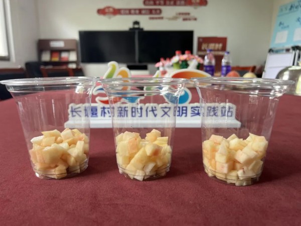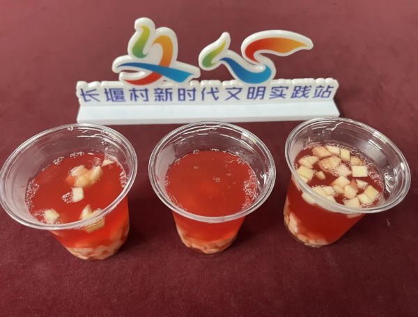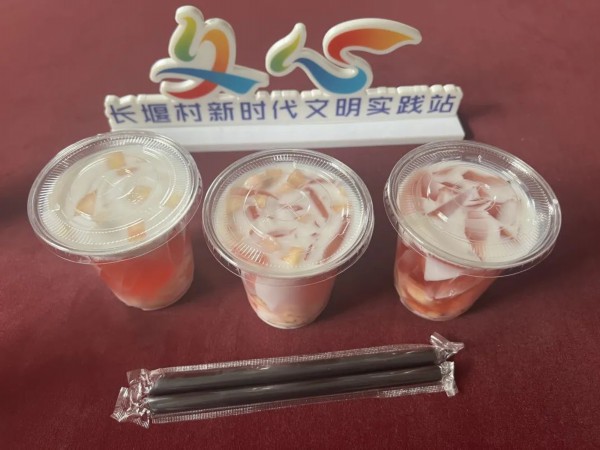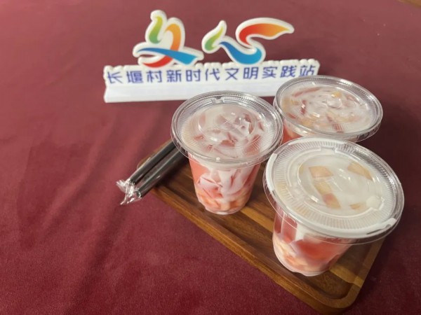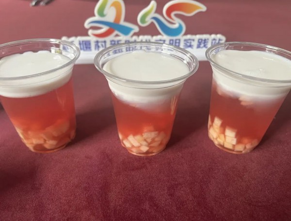 4、将切好的果肉倒入杯中,再将白凉粉水倒入杯中直至冷却凝固;最后将椰汁倒入,搅拌后即可食用。(可将饮品冰箱冷藏后口感更佳)