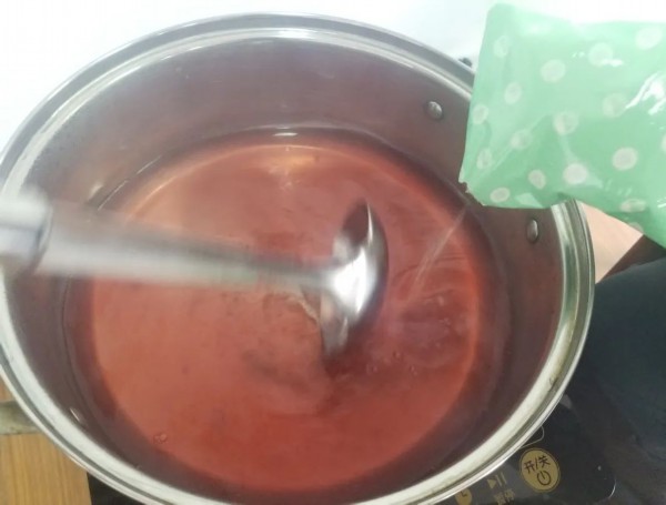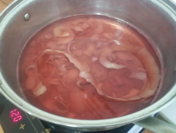 2、将桃皮放入1200毫升水中,加入若干冰糖、少量红曲粉一起煮沸至汁水呈现粉色,将果皮捞出。
