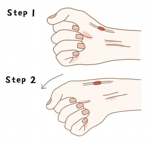 1.大拇指握在手心里,手腕向小拇指侧方轻轻向下压。