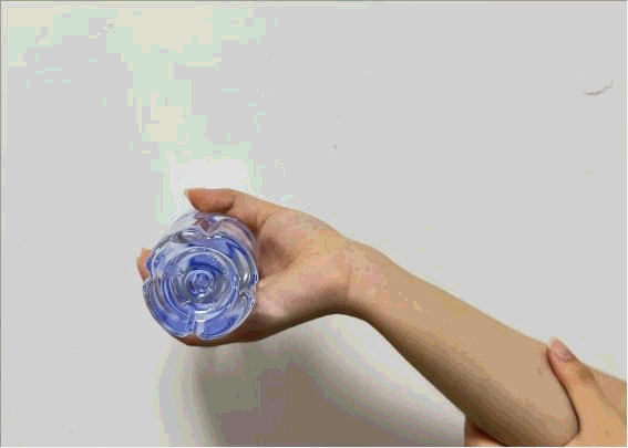 使用小哑铃(可用500ml左右矿泉水替代),手心向上,缓慢放松手腕,屈曲手腕至末端,不要引起疼痛,放松手腕,重复10次。