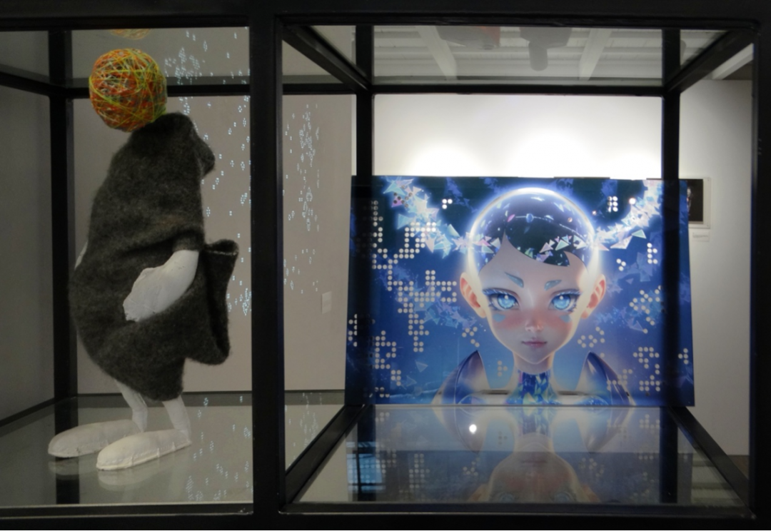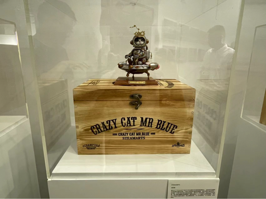 来自徐汇的艺术家项哲青此次带来蒸汽朋克风格手办,以猫为主题,每个作品都出自手工。比如《蓝先生》作品用到了树脂、木头、金属,加上具有复古质感的黄铜,一只可爱的猫咪手办造型呈现。值得一提的是,艺术家为每个作品都构建了故事。有着雕塑系专业背景的他已经从事了11年的艺术手办工作,为了加入时下流行的人工智能,此次也展出了与AI作画一起创作的艺术作品。“对我来说,这是新的尝试,希望能和我热爱的手办很好地结合。”