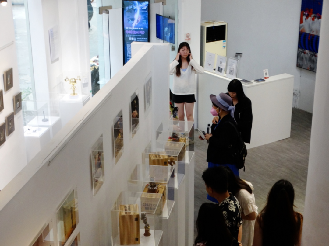 记者在现场看到,展品形式各样,近四十位青年艺术家们借助绘画、雕塑、影像、文字、装置乃至虚拟现实等多种媒介进行创作,让观众在多样的艺术形式中领略到AI艺术的无限可能性。许多观众对于此次AI艺术展感到新鲜又惊奇,AI辅助生成的艺术作品给观众带来的内心震撼,并不亚于传统艺术品所带来的体验。此外,有机会还能与艺术家本人畅聊作品背后的故事。