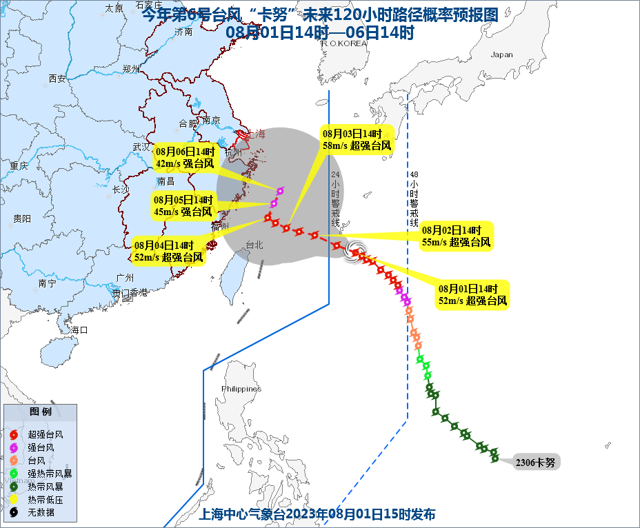 预计“卡努”台风中心8月2日上午进入东海,向浙江中部至福建北部一带沿海靠近,4-6日可能在上述沿海海面回旋少动。今明天浙江北部沿海海面阵风将逐渐增强到8~9级,浙江中部和南部沿海海面阵风可达9~10级。
