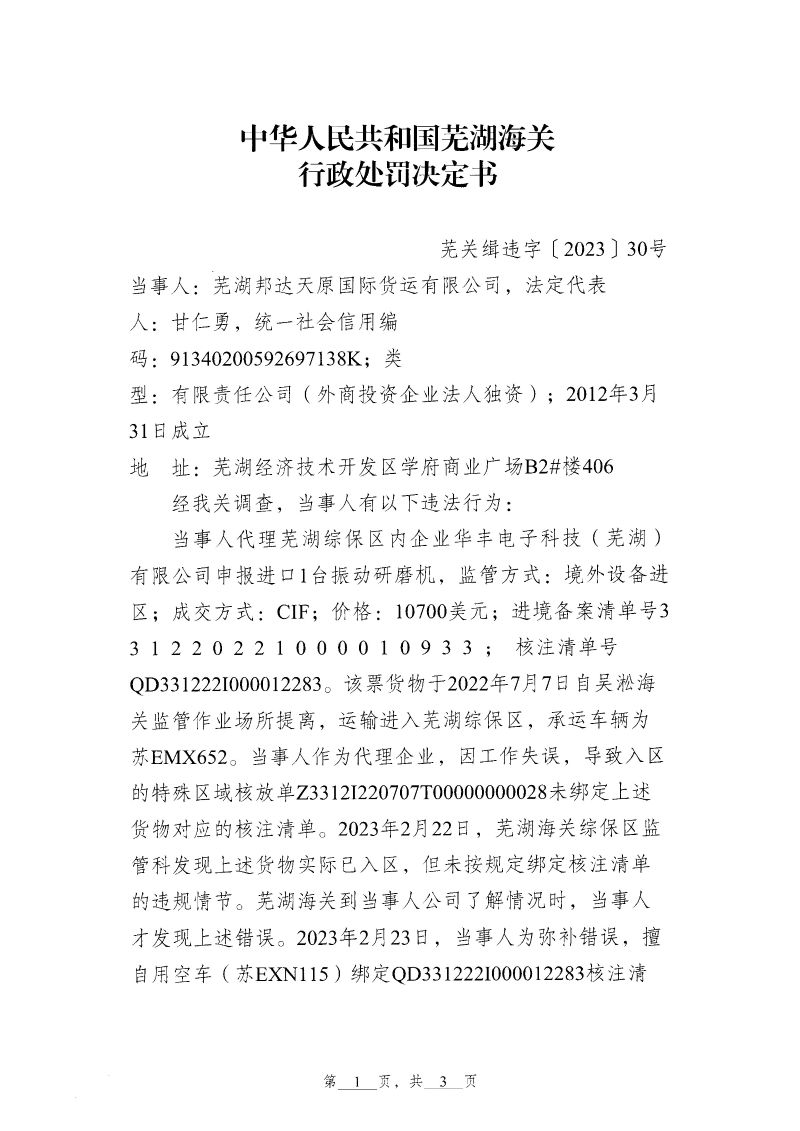 芜湖海关对芜湖邦达天原国际货运有限公司作出行政处罚