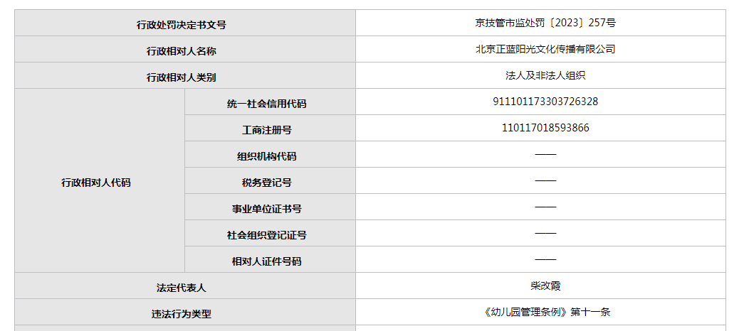 中国质量新闻网讯(闫冬)近日,北京市市场监督管理局网站公开一则行政处罚决定书。北京正蓝阳光文化传播有限公司(以下简称当事人)因违反《幼儿园管理条例》被北京经济技术开发区管理委员会查处。