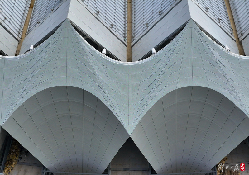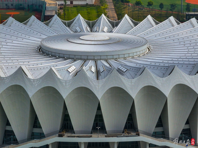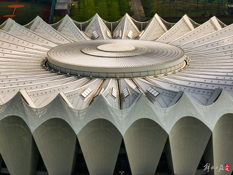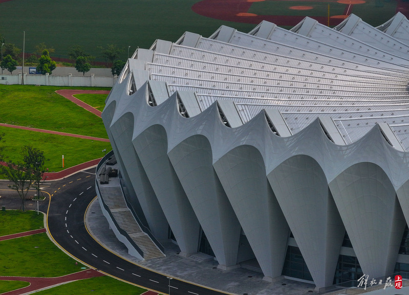 2023年8月11日,建设者在上海自行车馆进行外围施工。