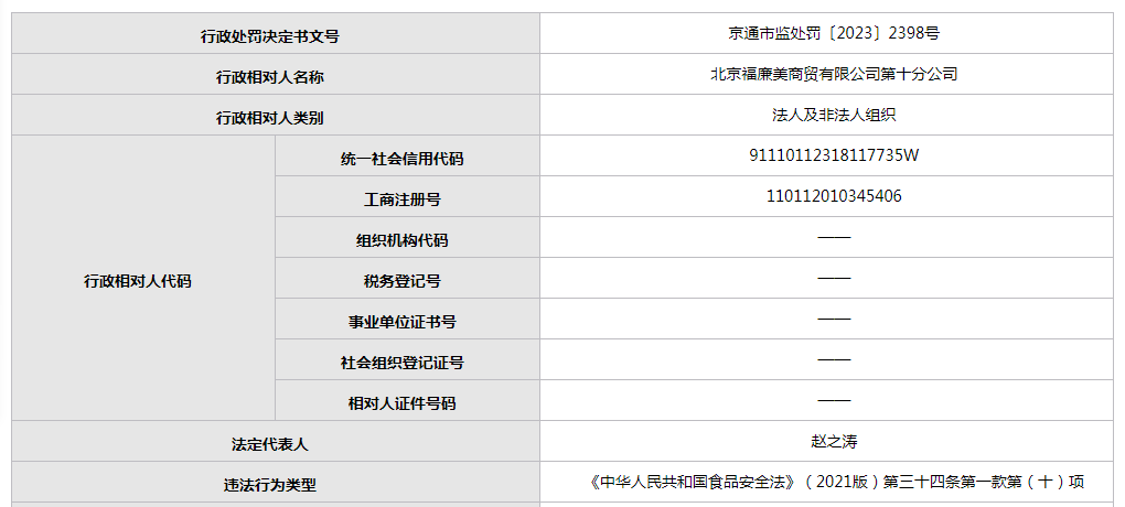 北京福廉美商贸公司第十分公司卖过期食品被处罚