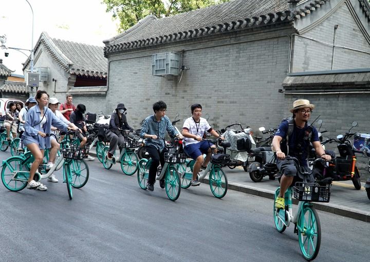 7月11日,卢福泉(右一)带领北大骑行课的同学们在北京金鱼胡同骑行。新华社发