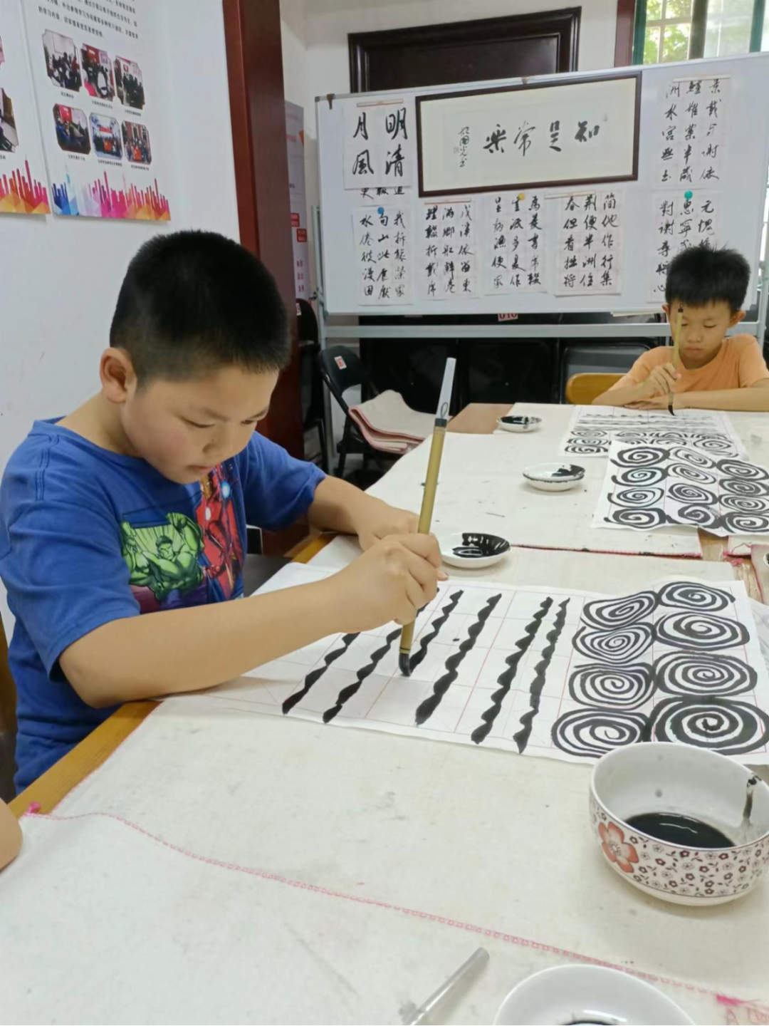 “画蚊香的要点有四个,一要中锋,二要慢,三要粗细一致,四要间隔均匀。先练习一段时间的画蚊香,再进行横练习、弧形练习等。”书法老师介绍说,这些都是基本功训练,非常重要,效果也非常好。