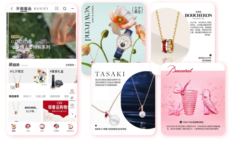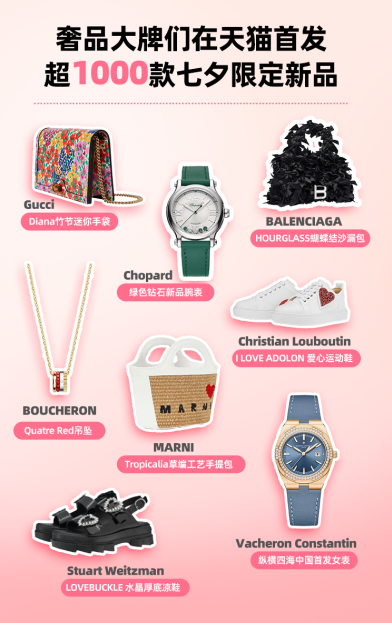 距离七夕还有不到一周的时间,奢品大牌们在天猫全力上新。今年,奢侈品牌们在天猫首发了超过1000款七夕的节日限定新品,其中,不少是全球限量首发款、中国市场定制款。款款是顶流。