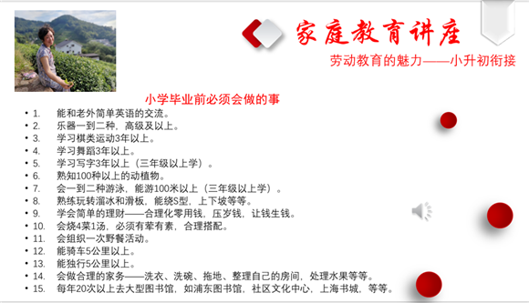 接下来,学校资深老师蔡微琼为新生家长带来了精彩的家庭教育微讲座——《劳动教育的魅力》。先从“小学毕业前必须会做的15件事”中的劳动内容展开,由劳动引申到培养孩子自信品质和学习习惯的养成。其次是让孩子自己组织策划旅行攻略,在实践中获得综合能力的提升。案例鲜活,对家长们具有指导意义。