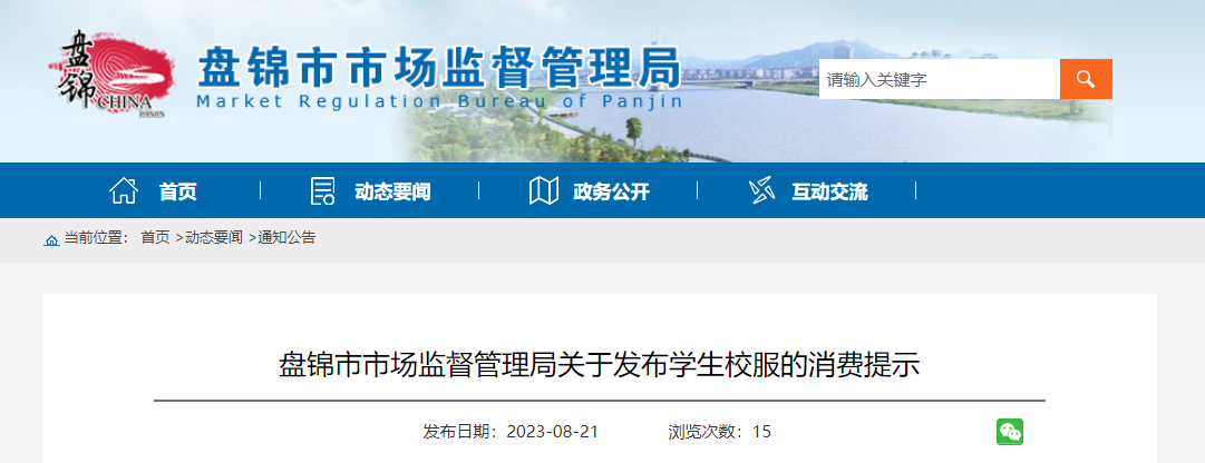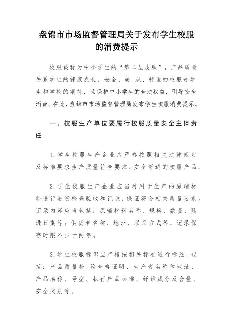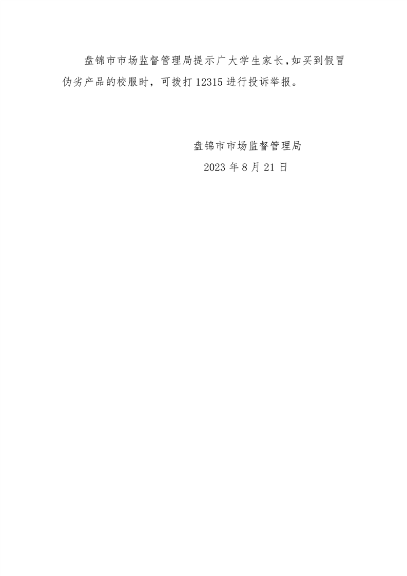 辽宁省盘锦市市场监管局发布关于学生校服的消费提示