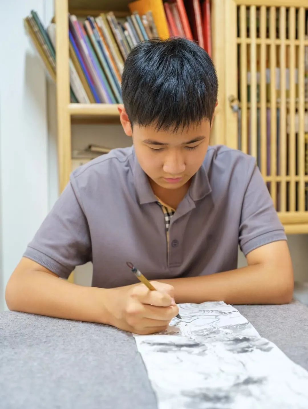 在世外中学就读的冯彦恺开学后即将升入初三,如何平衡好学业与爱好?“学习时就一门心思只想学习的事,完成后剩下的时间就可以发展兴趣,如果一心二用的话,其实两样都发展不好”,冯彦恺告诉记者,全神贯注、避免内耗,习画十年,这个爱好已经改变了他太多,“从毛毛躁躁到能坐得住,心态变得比较平稳,可以安静地画一幅画,时间在不知不觉中流走,其实把我的耐心锻炼出来了。”