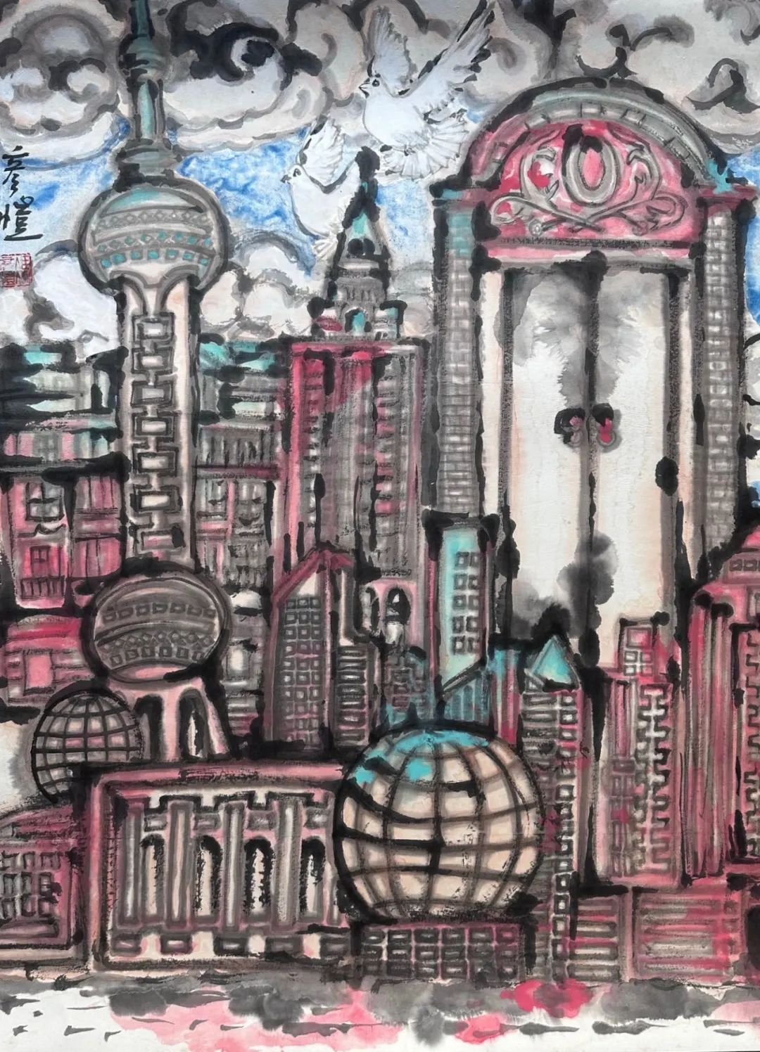 “把石库门、外滩的建筑和陆家嘴的新建筑一起,用中国水墨画的形式表现出来”,冯彦恺告诉记者,尽管在同龄人中,漫画如今是大家喜欢的主流,但国画的线条之美,黑白灰三色即可创造的大千世界让他觉得“非常高级”,在新技术、新媒体争奇斗艳的今天,尤其值得“发扬光大”。