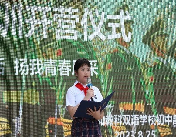 其次,学生代表六4班刘奕昕发言,她表示,“通过这次军训,不仅学到了军事知识,更深刻体会到了团队的力量和集体的力量。在未来的学习和生活中,我们一定会更加自律、自信、坚强,为自己的梦想扬帆起航。”