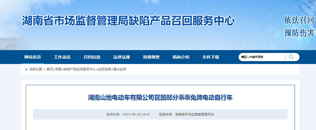 湖南山地电动车有限公司召回部分乖乖兔牌电动自行车