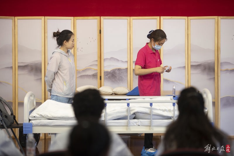 评委盯着选手在护理过程中的每一个细节,逐项打分。