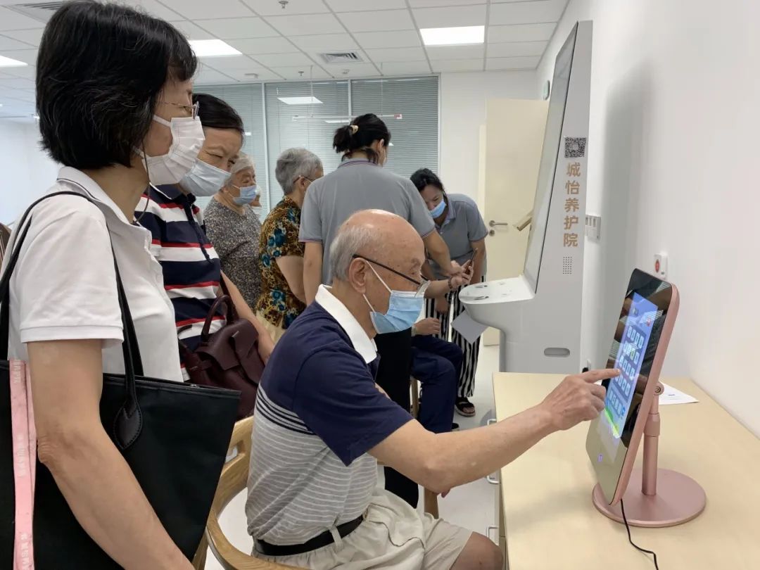 活动康复中心作为城怡养护院的一大亮点,引来参观者连连赞叹。多款智慧养老设备引人瞩目:将双手放在仪器上,几分钟内健康监测一体机就能出具一份有血氧、基础代谢数据的健康报告;站在认知功能筛查训练触屏一体机前,根据屏幕内容尝试成语接龙的同时,既锻炼大脑又收获了知识;健康一体机则只需伸出一只手,就能测量血压、血氧、心电图等。