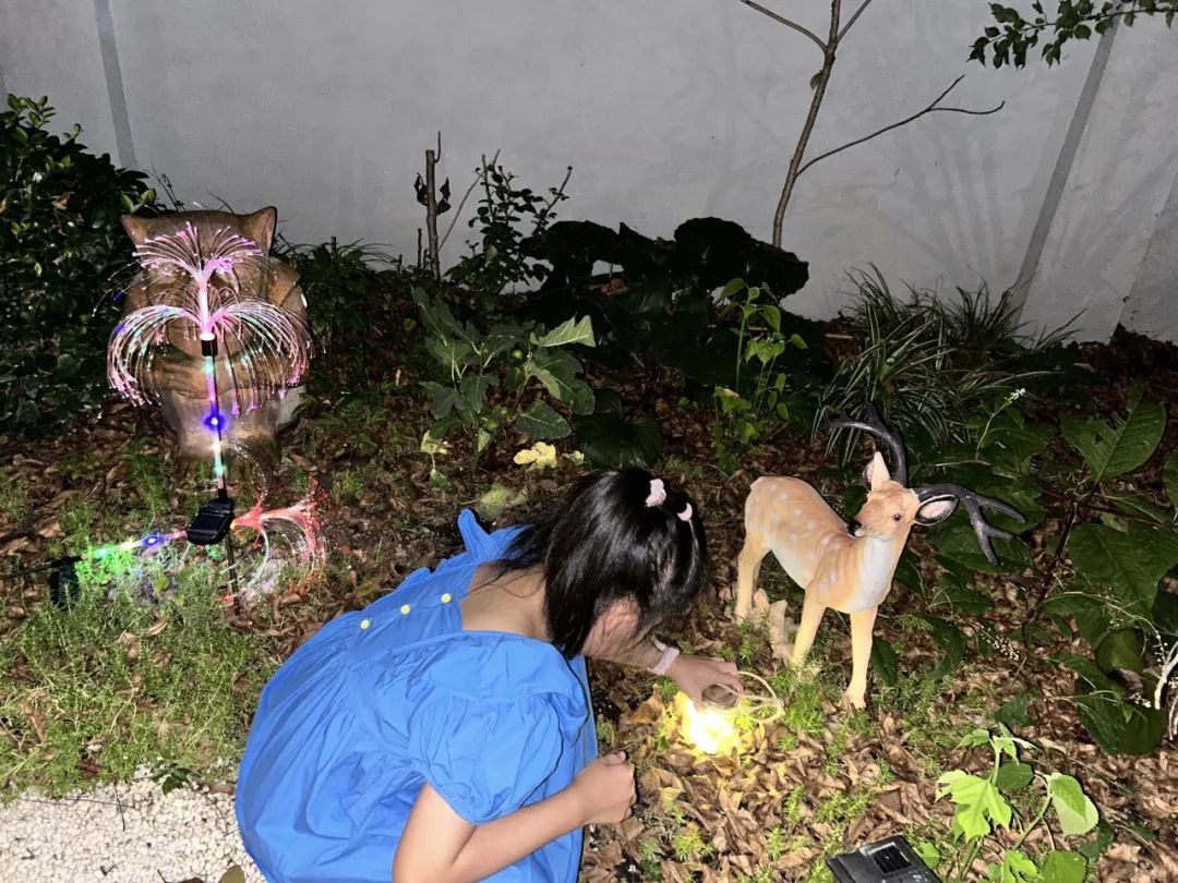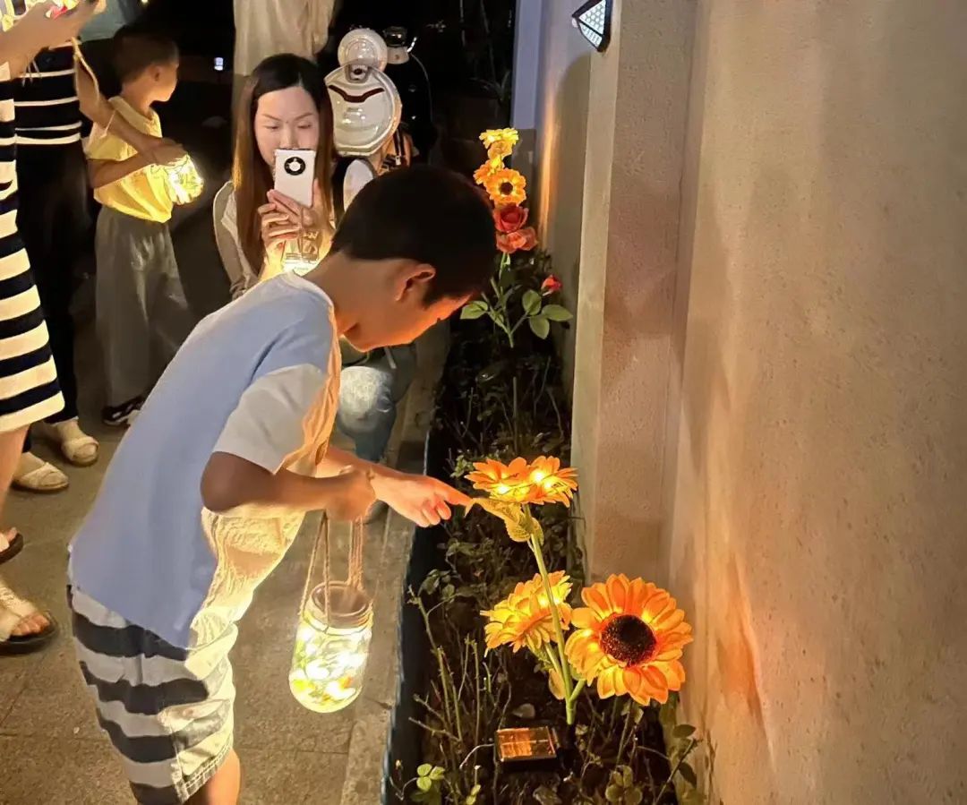 夜游开始之前,陕新居委准备了“萤火虫灯”DIY手作活动,孩子们通过丰富的想象力和动手能力制作了一盏独一无二的小夜灯。夜幕降临,大家迈着轻松愉快的步伐,手持自制的萤火虫灯,开始夜游园。一进入小花园,孩子们的眼前豁然开朗,有的花园里,居民们点缀上了各种会发光的巨型花卉,向日葵、玫瑰花……宛如一个神奇的植物乐园;有的花园,居民们在草地中放置了小白兔、梅花鹿等景观,在彩灯的映照下宛如一个童话世界;还有的花园里,漫天繁星般闪烁的彩灯,让人仿佛置身于梦境之中,带给孩子们非凡的童趣时光。