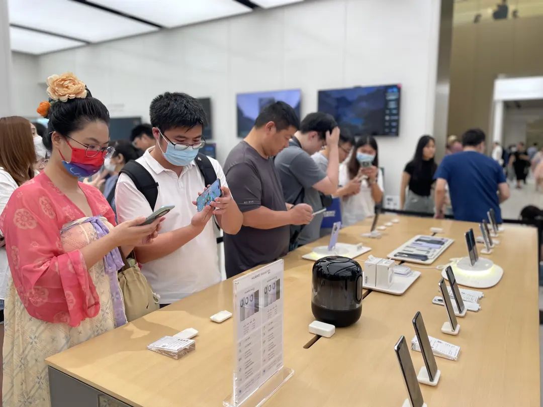 9月3日晚6点不到,虽然户外大雨磅礴,但记者在位于南京路步行街的华为旗舰店内却人声鼎沸,热闹非凡。一楼大厅内长长的队伍显的格外显眼,而大家的目标正是想感受全新华为Mate 60 Pro手机。
